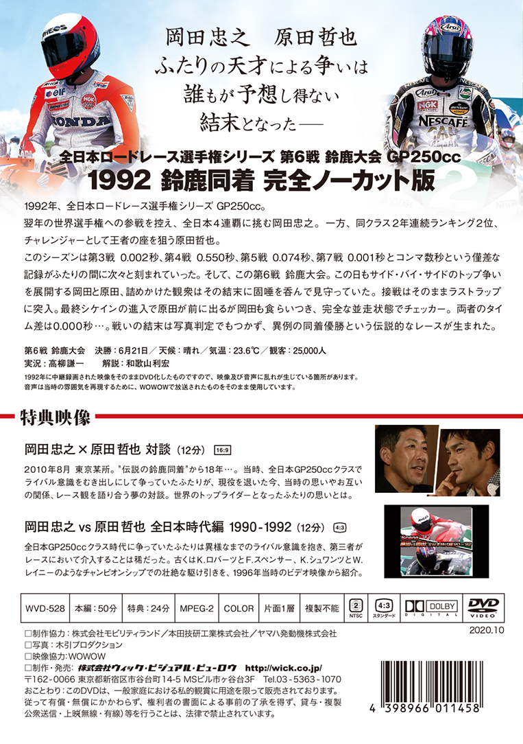 あれから18年の時を経て行われた岡田忠之と原田哲也の対談。さらに全日本時代の2人の対決を綴った特典映像を収録!ロードレースファン必見の作品。